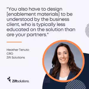 Zift Solutions’ Tenuto points out that resources partners share with customers should be similarly easy to consume. “The enablement materials that make their way to clients also need to be simple,” says Tenuto. “You also have to design them to be understood by the business client, who is typically less educated on the solution than are your partners.”