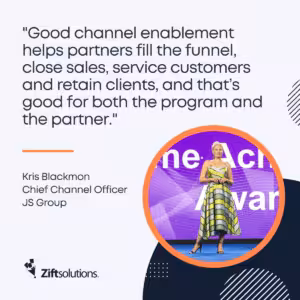 “We’re all in this business to make money, and proper enablement helps both the vendor and the partner reach that goal faster,” says JS Group’s Blackmon. “Good channel enablement helps partners fill the funnel, close sales, service customers and retain clients, and that’s good for both the program and the partner.”
