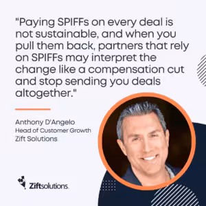 Zift Solutions’ D’Angelo agrees that making incentives an expectation on every sale will eventually backfire. “A sales incentive should be a reward for closing a deal of a certain size, target vertical or another criterion,” D’Angelo says. “Paying SPIFFs on every deal is not sustainable, and when you pull them back, partners that rely on SPIFFs may interpret the change like a compensation cut and stop sending you deals altogether.”