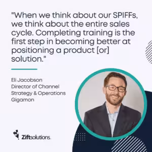 Gigamon’s Jacobson says his company provides incentives for completing training. “When we think about our SPIFFs, we think about the entire sales cycle. Completing training is the first step in becoming better at positioning a product [or] solution. Once there is a foundational knowledge of the solution, this leads to deal registrations and eventually the successful closure of opportunities,” he says.