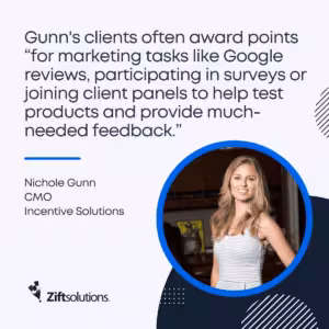 Incentive Solutions’ Gunn agrees, noting her clients often award points “for marketing tasks like Google reviews, participating in surveys or joining client panels to help test products and provide much-needed feedback.”