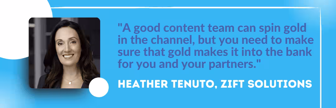 Zift’s Tenuto agrees. “A good content team can spin gold in the channel,” she notes, “but you need to make sure that gold makes it into the bank for you and your partners. When selecting technology, it’s important to think past what you need at the moment to what you might need in the future. The more flexibility in your platform, the better.”