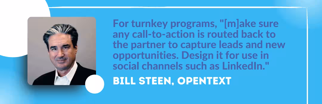 Bill Steen from cybersecurity and cyber resilience provider OpenText Security Solutions advocates simplicity as part of the turnkey process. “Make it short, sweet, relevant and interesting to the end-customer,” he says, adding that it’s also important to promote the partner’s business. “Make sure any call-to-action is routed back to the partner to capture leads and new opportunities. Design it for use in social channels such as LinkedIn.”