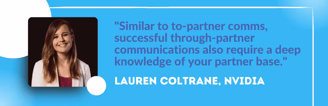 “Similar to to-partner comms, successful through-partner communications also require a deep knowledge of your partner base,” says Lauren Coltrane from hardware, graphics, computing and AI company NVIDIA. “Without this knowledge, your marketing teams are likely creating content that, ultimately, is not helpful to your partners.”