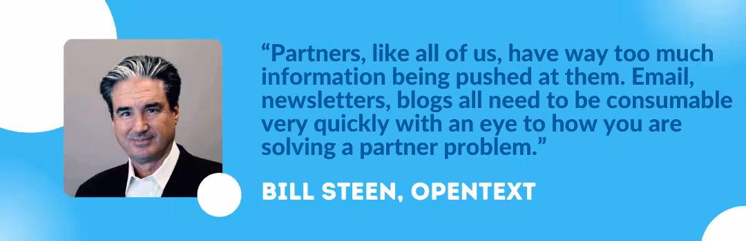 “Keep it brief and to the point!” says OpenText Security Solutions’s Bill Steen. “Partners, like all of us, have way too much information being pushed at them. Email, newsletters, blogs all need to be consumable very quickly with an eye to how you are solving a partner problem.