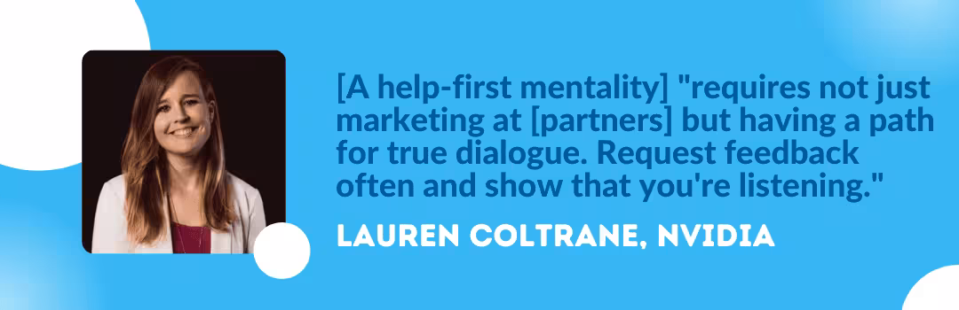 NVIDIA’s Coltrane agrees and advocates for creating a “help first” mentality. “To do this effectively, there needs to be a deep understanding of your partners’ needs,” she says. “This requires not just marketing at them but having a path for true dialogue. Request feedback often and show that you’re listening by putting that feedback into action.”
