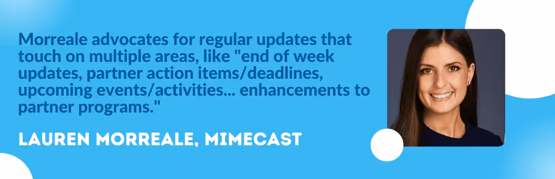 Morreale from Mimecast advocates for regular updates that touch on multiple areas, including “end of week updates, partner action items/deadlines (i.e., compliance), upcoming events/activities, new trainings/certifications, partner SPIFFs, enhancements to partner programs.”