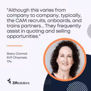 “Although this varies from company to company, typically, the CAM recruits, onboards, and trains partners,” adds TPx’s Conrad. “They frequently assist in quoting and selling opportunities, handling escalations, and helping them overall navigate within the provider’s organization. They might also assist with commissions.”